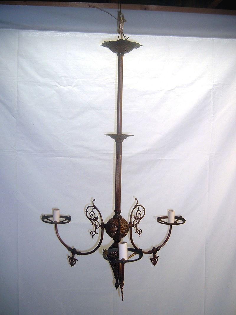 This three-armed gas fixture was in rough shape when it came to us to be restored and electrified. We were able to straighten out all of the bent and twisted arms, and then we converted it to electric, adding fitter rings ready to accept a set of gas shades. Now it is a fully restored ceiling light fixture ready for a new home.