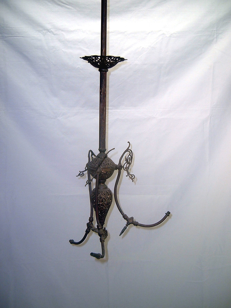 We bought this shade knowing that the filigree overlay was missing on one of the panels. We removed the glass panels, made a mold using one of the in-tact panels, filled the mold, let it set, and then shaped it to fit properly into the existing overlay. Then we soldered it in place, color matched to the surrounding metal, and put the glass back in place. So now we are ready to send this good as new table lamp off to live again.