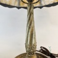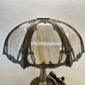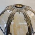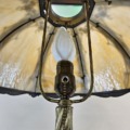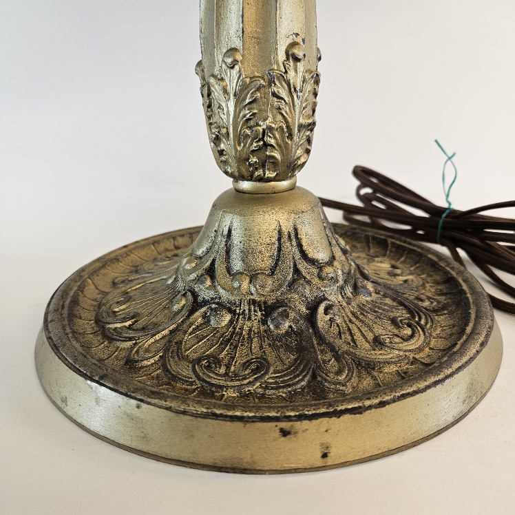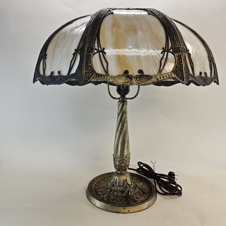 This beautiful Art Nouveau slag glass table lamp with eight panels hails from c. 1920. Antique lamps with eight panels in the shade are very difficult to find in good condition, so this one is a real treasure! It’s not perfect; it’s showing its age. But I hope I look as good by the time I’m 105 years old! LOL! The base is made of cast iron and pot metal with a gold wash. The glass panels in the shade are beige with a caramel swirl. All of the shade’s filigree work, also referred to as overlay, is intact. The lamp has one pull-chain switch and can accommodate one incandescent bulb up to 60W maximum, or its equivalent.