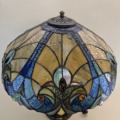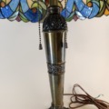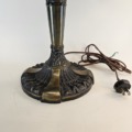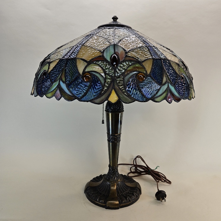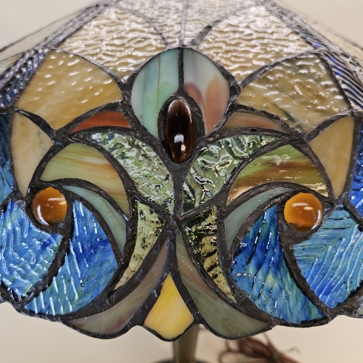 The base of this brass and cast iron table lamp dates to about the 1920s. It shows minor wear commensurate with age. The lamp has two pull-chain switches. The beautiful shade, which is made of textured stained glass creating a mosaic pattern, is a replacement. The colors are stunning, not just when the lamp is off, but especially when the lamp is lit.