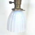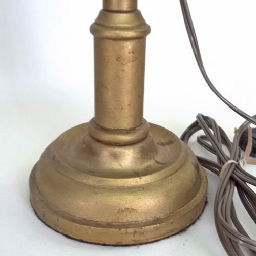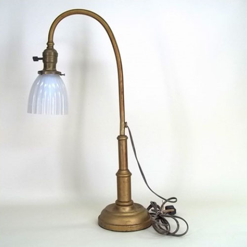 Very simple brass desk lamp with vintage gold wash and turn switch, marked “Patented 7/28/03 & 2/23/04” on fitter ring. Has vintage, lightly scalloped and camphored glass shade. Perfect for desk, end table, mantel, etc. Measures 21 1/2″ high by 12″ from front of shade to back of base. Base is 5 1/2″ in diameter. Rewired.