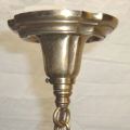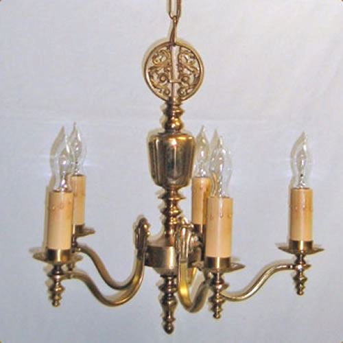 Hefty, solid brass five-armed chandelier with dragons, c. 1925-35. Has even patina, lacy bobeches, and dragons in the circle above the hub. Also has its original porcelain sockets. Clip-on shades can be added. Requires wall switch. Perfect for living room, dining room, bedroom, library, entrance way, stairway, etc. Measures 42″ long (includes 21″ of chain) by 18″ wide. Rewired with ground wire added.