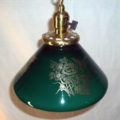 Simple clean brass pendant, marked “Patented Dec 24 1912″ on fitter ring, with cased green shade that has gold flowers and birds design repeating three times on the outside of the glass. Can be operated by the turn switch, or placed in the ON position and operated by a wall switch. Perfect for over kitchen sink, in hallway, entrance way, bedroom, bathroom, etc. Measures 23 1/2″ long (including 7″ of chain) by 10” wide. Rewired with ground wire added.