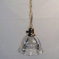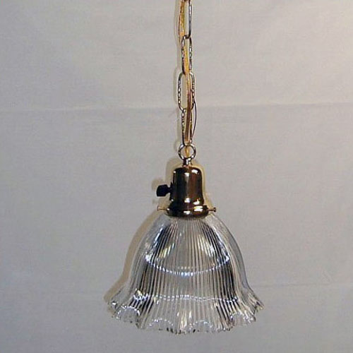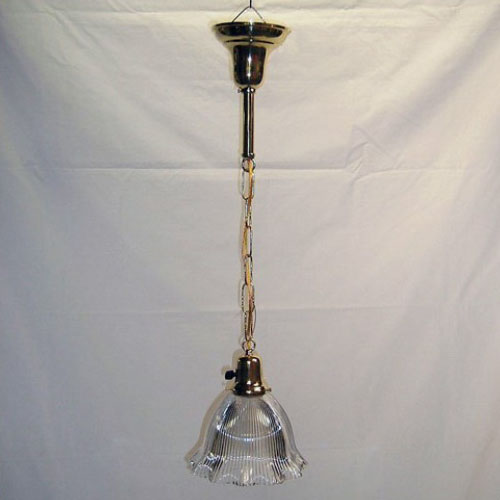 Shiny brass pendant with Holophane-style shade, c. 1930s. Can be operated by the turn switch or placed in the ON position and operated by a wall switch. Perfect for bathroom, hallway, entrance way, walk-in closet, over the kitchen sink, etc. Measures 28″ long by 8″ wide. Rewired with ground wire added.