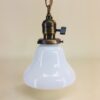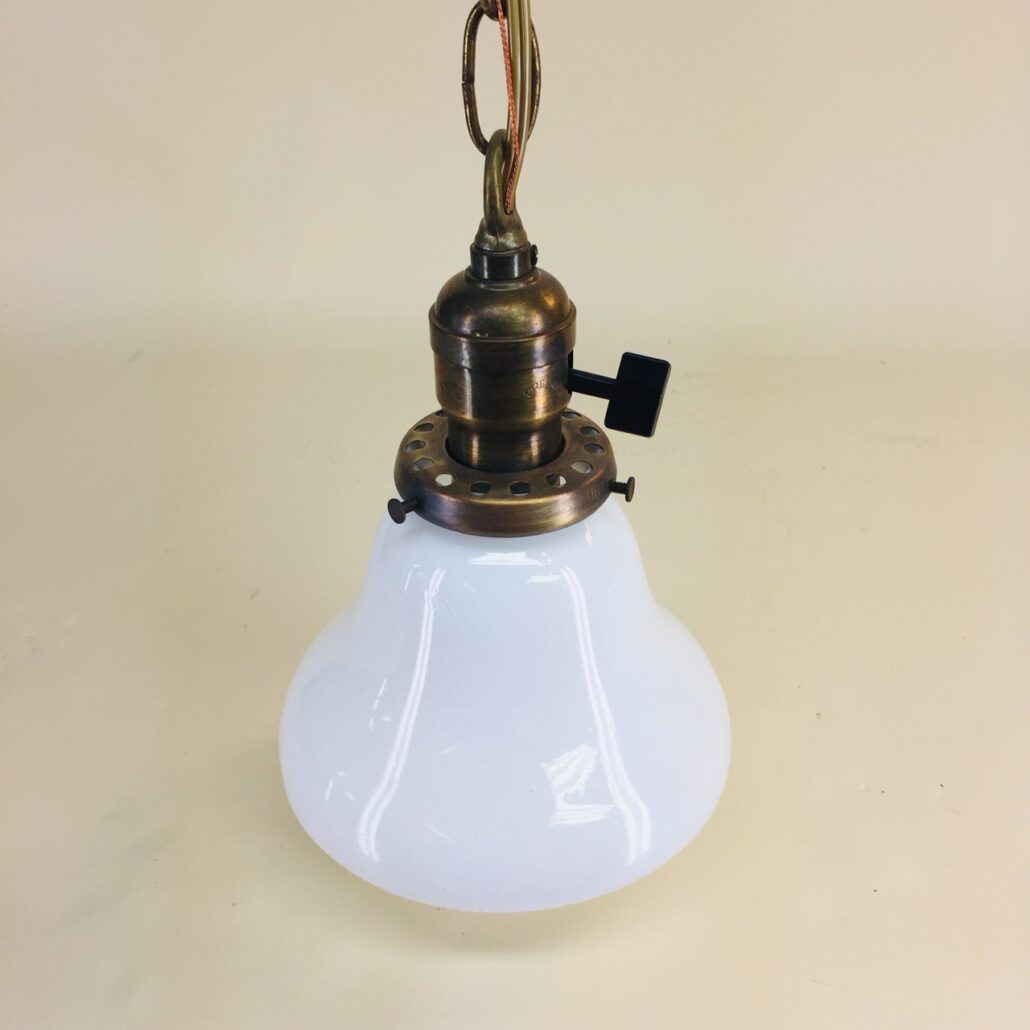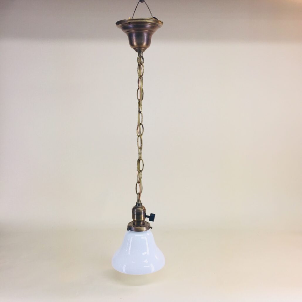 This single brass pendant with white opal glass bell shade hails from c. 1930s. It can be operated by the turn switch on the fixture itself, or you can place the switch in the ON position and use a wall switch instead. Perfect for over the kitchen sink, in a bathroom, pantry, closet, hallway, or anywhere additional light is needed. Currently measures 24″ long, including 13 1/2″ of chain, by 5 1/2″ across the shade bottom. This fixture can be shortened easily to fit in a smaller space. Rewired with ground wire added.