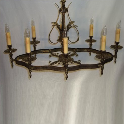 Simple but elegant cast brass oval chandelier with eight lights and decorative casting designs, probably made in Spain but unsigned, c. 1940. Oval scalloped shape is unusual. Requires wall switch. Perfect for dining room, living room, library, bedroom, etc. Measures 48″ long (including 24″ of chain) by 31 1/2 x 20″ oval. Rewired with ground wire added.