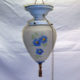 Shabby chic crystal basket on chrome ceiling pendant, signed “Made in Canada”, c. 1950. Has one light. Requires wall switch. Perfect for bathroom, hallway, entrance way, over the kitchen sink, etc. Measures 18 1/2″ long by 6″ wide. Rewired with ground wire added.