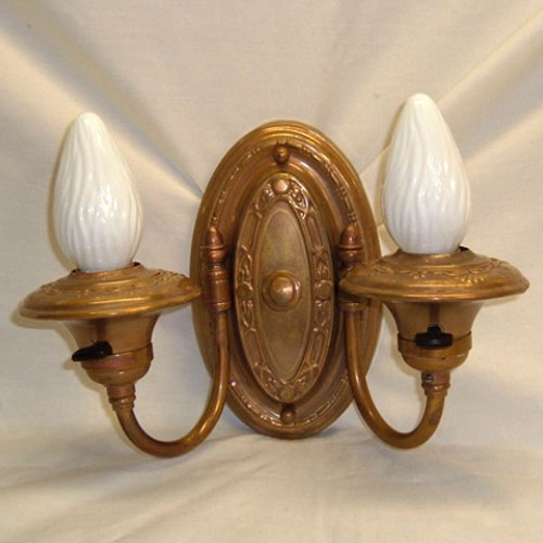 Double-armed brass wall sconce with simple design, turn switches and rich patina, probably made by the Miller Company but not signed, c. 1930s. Can be operated at the sconce, or placed in the ON position and operated by a wall switch. Perfect for bathroom, hallway, pantry, staircase, or any other tight spaces. Measures 7 1/2″ high by 10″ wide by 5 1/2” deep. Rewired with ground wire added.
