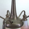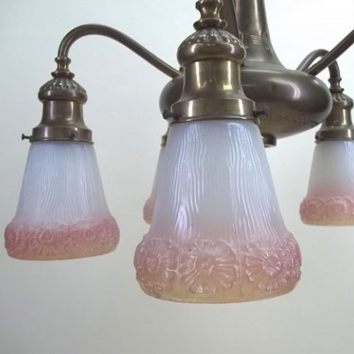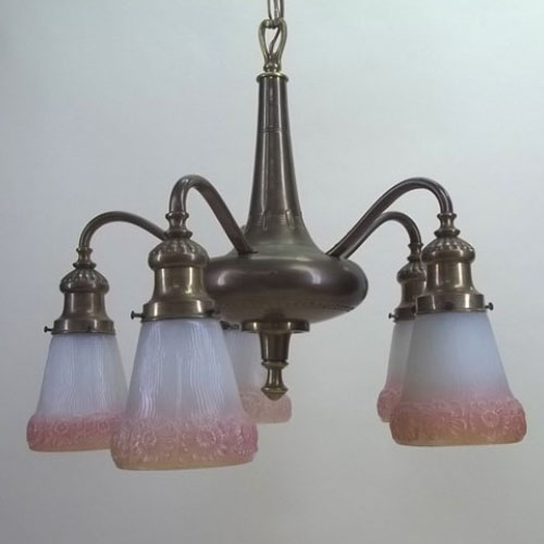 Vintage five-armed brass chandelier with simple lines and rich patina, c. 1930s. Has ribbed glass shades that have raised, reverse painted pale apricot flowers along the bottom edge. Decorative chain adds nice accent. Requires wall switch. Perfect for a dining room, entrance way, stairwell, hallway, bedroom, etc. Measures 38″ long (including 18″ of chain) by 20″ wide. Rewired with ground wire added.