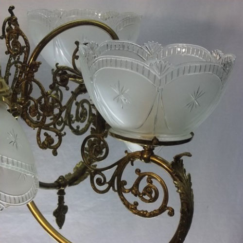 Spectacular brass 4+4 gas/electric chandelier, now all electric, in pristine condition with matching gas and electric signed Gillinder shades. Perfect for dining room, living room, grand staircase, big entrance way, master bedroom, etc. Measures 41″ long by 30 1/2″ wide. Gas arms are newly and carefully converted to electric and electric arms are rewired with ground wire added.