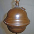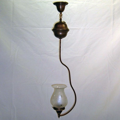 Difficult-to-find 1800s brass gravity feed kerosene lamp, now converted, with rich patina and original cork bobber in tank to measure level of fuel in its day. Vintage glass shade completes the fixture. Requires wall switch. Perfect for entrance way, staircase, over a kitchen island, library, etc. Measures 36 1/2″ long by 10″ wide. Newly converted to electric with ground wire added.