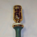Fully restored green table lamp with agate slab on base and small agate accent just below socket, c. 1940. Has push-through switch and replacement cloth shade. Perfect for anywhere petite lamp is needed. Measures 16 1/2″ high by 10″ across shade bottom. Rewired.