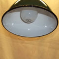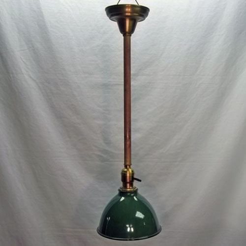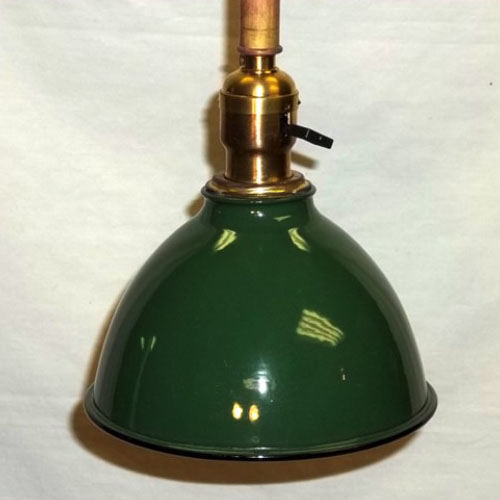 Simple brass industrial pendant with nice patina and one light inside green metal shade lined with white porcelain, c. 1940. Minor blemish on inside of rim; mentioning for accuracy. Operate by the turn switch, or place in the ON position and use a wall switch. Perfect for over the kitchen sink or island, over work bench, over desk or drafting table, in the garage, etc. Measures 23″ long by 7″ wide. Rewired with ground wire added.