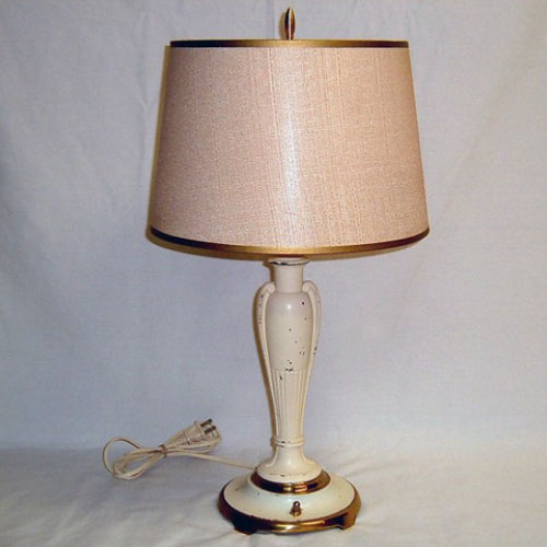 Vintage signed Miller table lamp with its original, aging cream-colored finish with gold accents, c. 1930s. Has on/off switch on base. Replacement shade with gold trim is supported by a signed Corning diffuser bowl and together, they complete the lamp. Perfect for a den, family room, bedroom, three-season room, or anywhere extra light is needed. Measures 21 1/2″ high by 12″ across the bottom of the shade. Rewired.