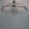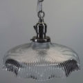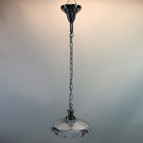 Difficult-to-find nickel ceiling pendant with Pagoda-style shade. Pendant is dated Dec. 24, ’12. Glass shade is ribbed and scalloped. Also has a reproduction Edison-style bulb, though any Edison-size bulb style would be fine. Can be operated by the switch on the pendant, or placed in the ON position and operated by a wall switch. Perfect for over the kitchen sink, bathroom, hallway, stairwell, etc. Measures 30″ long by 11″ wide. Rewired with ground wire added.