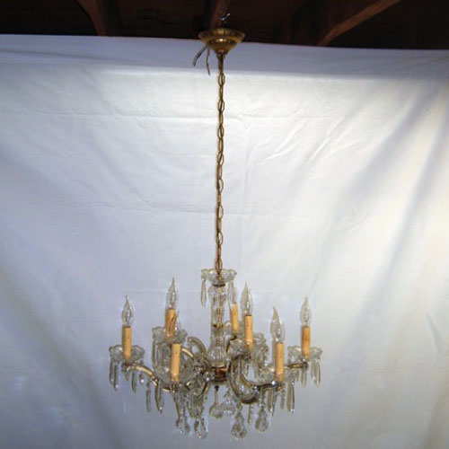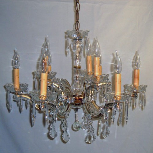Beautiful two-tiered, nine-light crystal chandelier, signed “Made in Italy”, c. 1940s, complete with crystal pendalogues and crystal ball at bottom center. Requires wall switch. Perfect for dining room, grand entrance way, master bath, staircase, library, etc. Measures 45″ long (including 24″ of chain) by 25″ wide. Rewired with ground wire added.