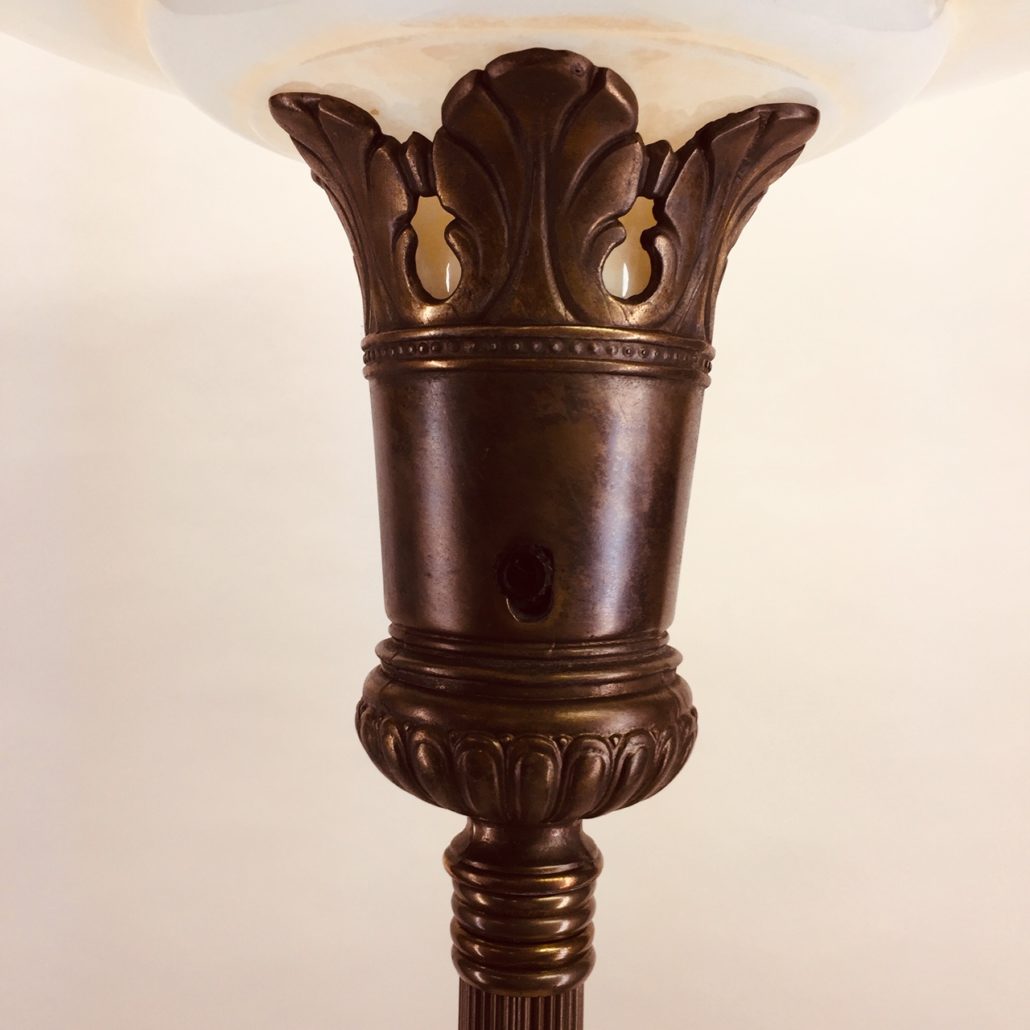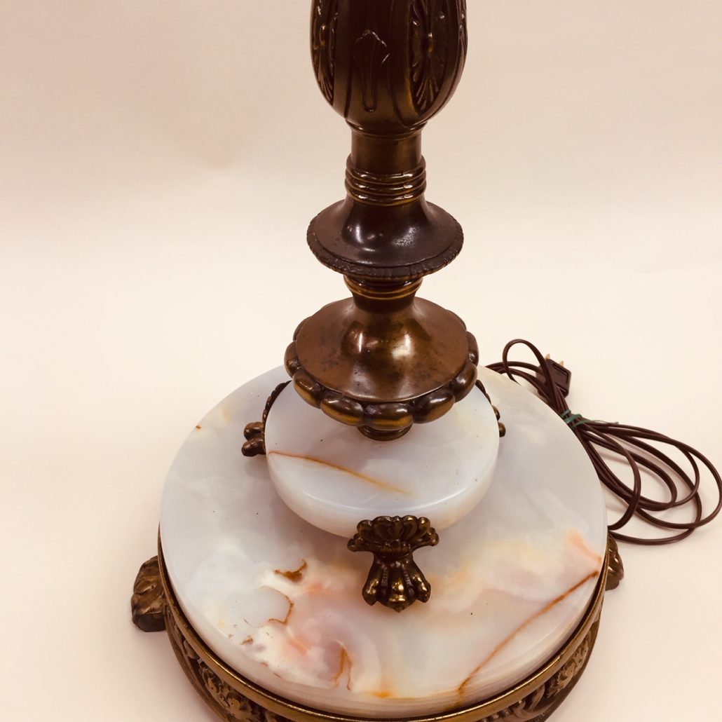 Beautiful, original 1930s torchiere floor lamp with three-way mogul bulb inside original glass shade. The mogul bulb has three settings: 50-100-150 watts (though any three-way mogul bulb would work). The shade is antique white with light brown accents. The base has two slabs of striated marble in excellent condition! It also has gorgeous details on the sides of the base (see photos). This lamp offers lots of upward-facing light and some diffused light into the room. Perfect for anywhere extra light is needed. Measures 64 3/4″ high by 16″ across the shade by 11″ across the base. Rewired.