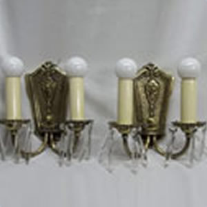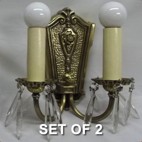 Spectacular pair of single-armed cast brass sconces with spear crystals and turn switches, signed “Franklin”, c. 1910. Can be operated at the sconces or placed in the ON position and operated by a wall switch. Perfect for dining room, hallway, entrance way, stairwell, bedroom, library, etc. Measure 10″ high by 8″ wide by 4″ deep. Rewired with ground wire added to each.