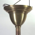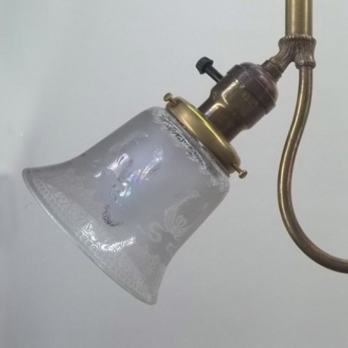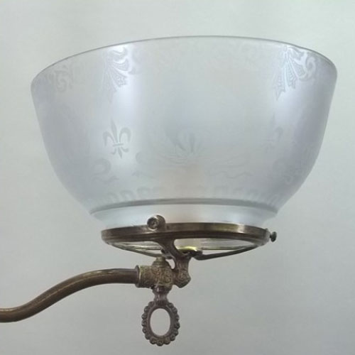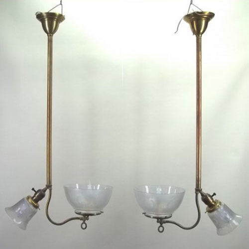 Difficult-to-find pair of gas/electric ceiling pendants with acid etched shades, c. 1900. Reportedly from the Russian Lady restaurant in Hartford, CT. One turn switch on each brass pendant operates both the gas (now converted) and the electric sides. Can also be placed in the ON position and be operated by a wall switch. Perfect for over an island, in a library, stairwell, flanking the fireplace, etc. Measure 33″ long by 16″ from far edge of one shade to far edge of the other. Newly wired with ground wire added to each.