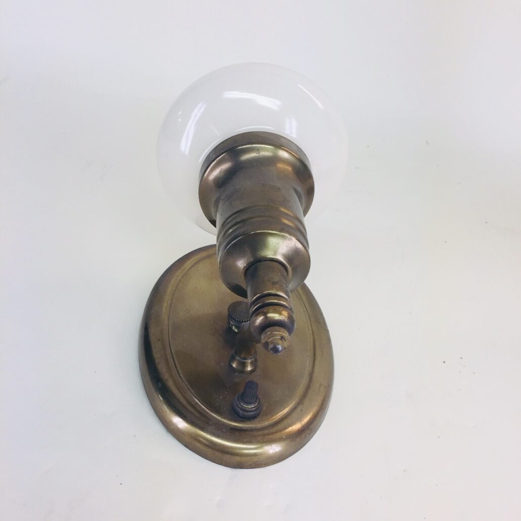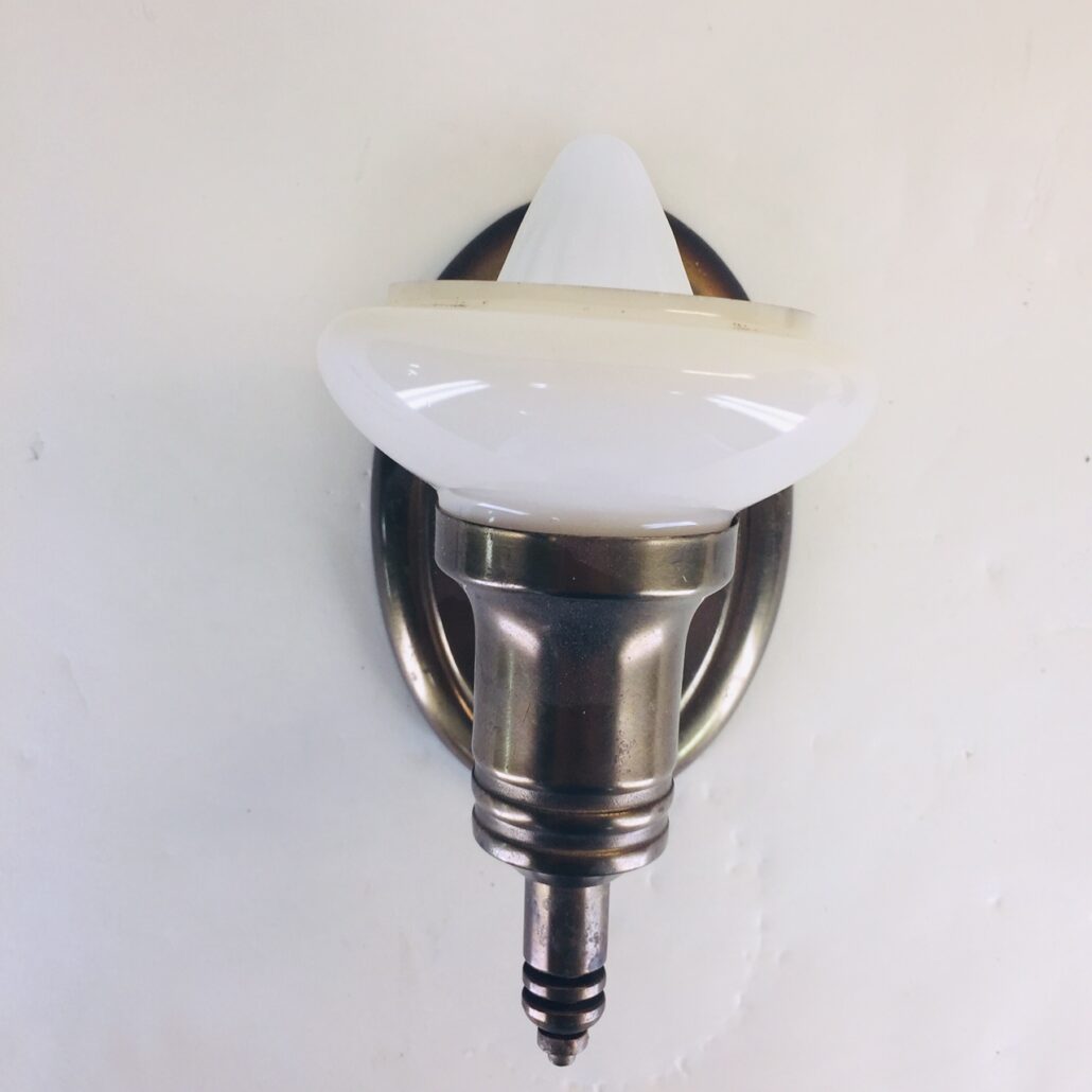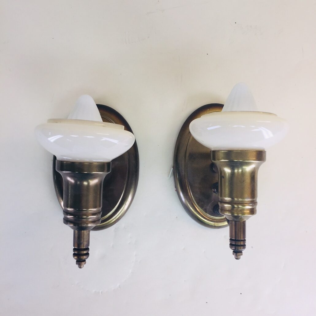If you’re looking for a pair of petite brass sconces with custard glass shades, you don’t need to look any further! These sconces are in excellent condition, with rich patina, c. 1920s. Each one has its own turn switch, so you can operate them at the sconces themselves, or place them in the ON position and use a wall switch instead. Great versatility! The shades have straight necks that fit into the cup of each sconce, and they are beautiful! Perfect for bathroom, bedroom, library, entryway, stairwell, kitchen, breakfast nook, etc. Each measures 6″ high by 4″ wide by 5 1/2″ deep. Rewired with ground wire added.