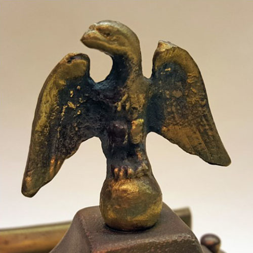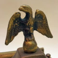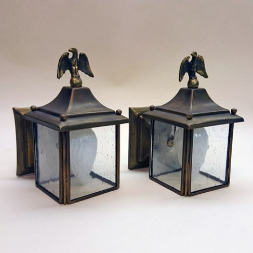 Great pair of petite brass wall sconces with textured rice glass, one light inside, and eagle finials, c. 1950s. Can be used inside or outside. Requires wall switch. Perfect for small entrance way, porch, narrow hallway, staircase, etc. Measure 7 1/2″ high by 4″ wide by 5 3/8″ deep. Rewired with ground wire added to each.