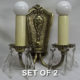 Great pair of single-armed cast brass wall sconces with hammered back plates and repeating design, c. 1920-30s. Possibly made by Williamson & Co. in Chicago but unsigned. Each has its own turn switch, so it can be operated at the sconce itself or placed in the ON position and operated by a wall switch. Great for dining room, living room, den, bedroom, office, bathroom, etc. Measure 11″ high by 4 1/4″ wide by 5″ deep. Rewired with ground wire added to each.