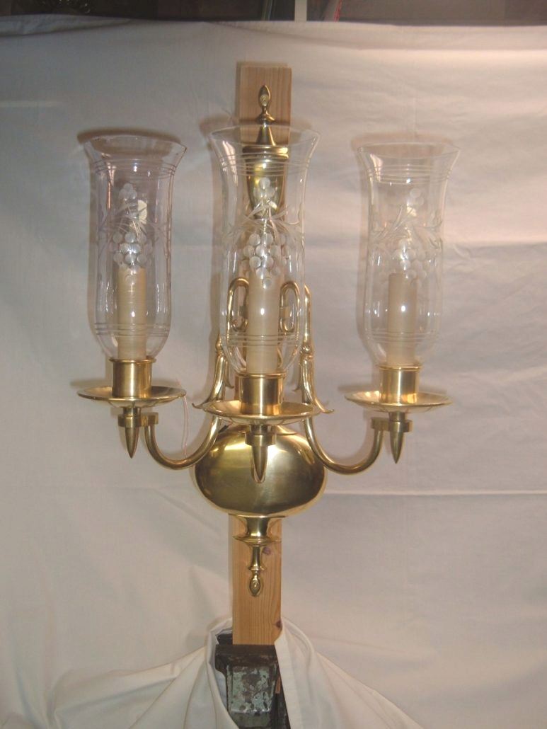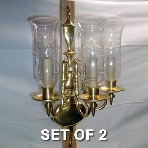 Elegant pair of three-armed wall sconces signed “Bradley & Hubbard“, brass with three original cut glass hurricane globes on each, c. 1910. A couple of the globes have tiny fleabites on the rim; mentioning for accuracy only. Require wall switch. Perfect for flanking a fireplace, in a dining room, in an office, library, great room, etc. Measure 17″ wide by 25″ high by 9 1/2″ deep. Rewired with ground wire added to each.