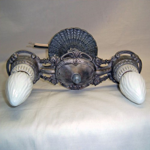 Petite flush mount fixture with exposed bulbs and steel gray finish, likely made of pot metal, c. 1920s. Requires wall switch. Perfect for houses with low ceilings, bathroom, hallway, pantry, back doorway, closet, basement stairs, etc. Measures 11″ wide by 9 1/2″ long. Rewired with ground wire added.