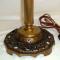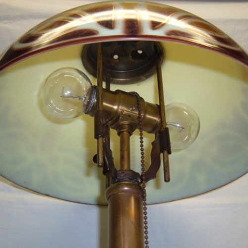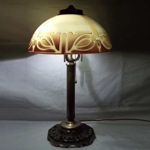 Petite, signed “PILABRASCO” (Pittsburgh Lamp Brass & Glass Company) lamp with its original custard glass dome shade with gold and brown accents, c. 1915-20. Has double switch with one pull chain. This petite Pittsburgh table lamp would be perfect for a library, living room, dining room, bedroom, etc. Measures 19 1/2″ high by 11 1/2” wide. Rewired.