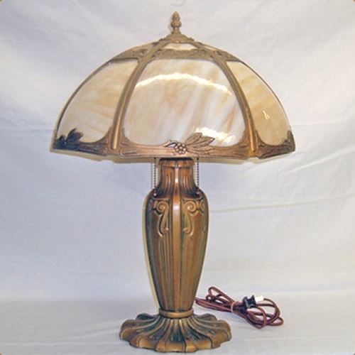 Unusual stamped brass table lamp signed “PLG&B Co.” (Pittsburgh Lamp Brass & Glass Co.) on inside of loader and base, c. 1920. Has two pull-chain switches. Original six-panel slag glass shade in excellent condition. This Pittsburgh table lamp would be perfect for a living room, bedroom, dining room, den, family room, office, etc. Measures 21 1/2″ high by 16″ wide. Rewired.