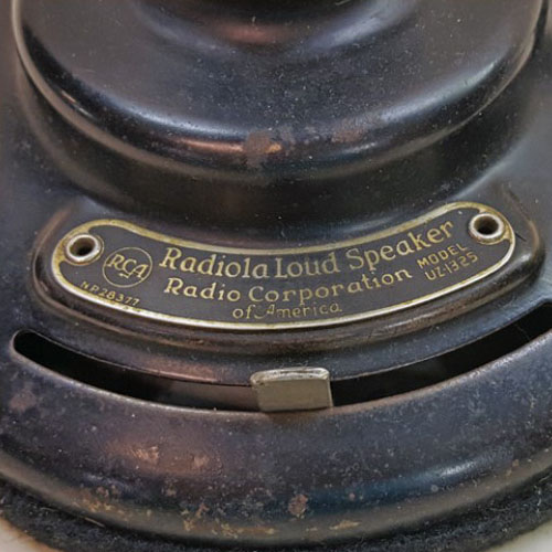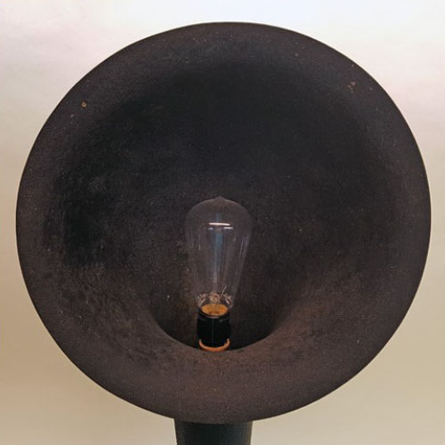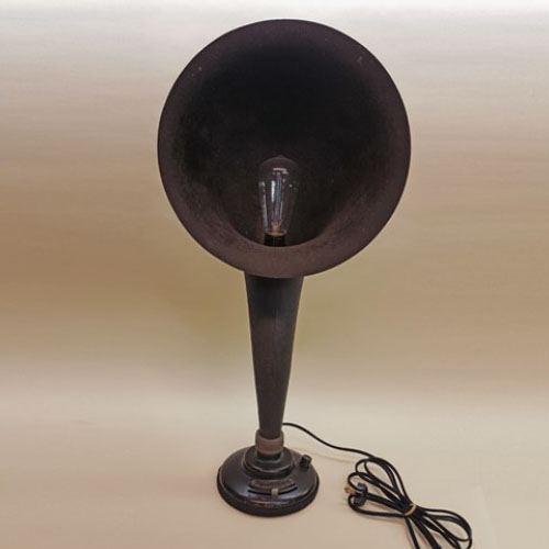 Old RCA loud speaker in excellent condition, dated 1924, converted to working table lamp with Edison-style bulb (any standard size bulb will work). Signed “Radiola Loud Speaker, Radio Corp. of America (RCA), No. 28377, Model UZ-1325”. This Radiola loud speaker table lamp would be perfect as a nightlight, conversation piece, or just for ambiance. Measures 25 1/2″ high by 12 1/4″ wide by 6″ base. Newly converted and wired.