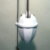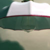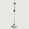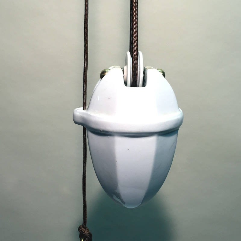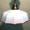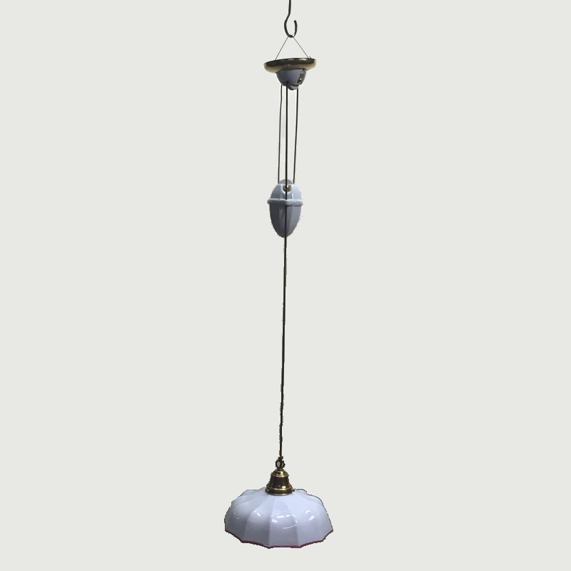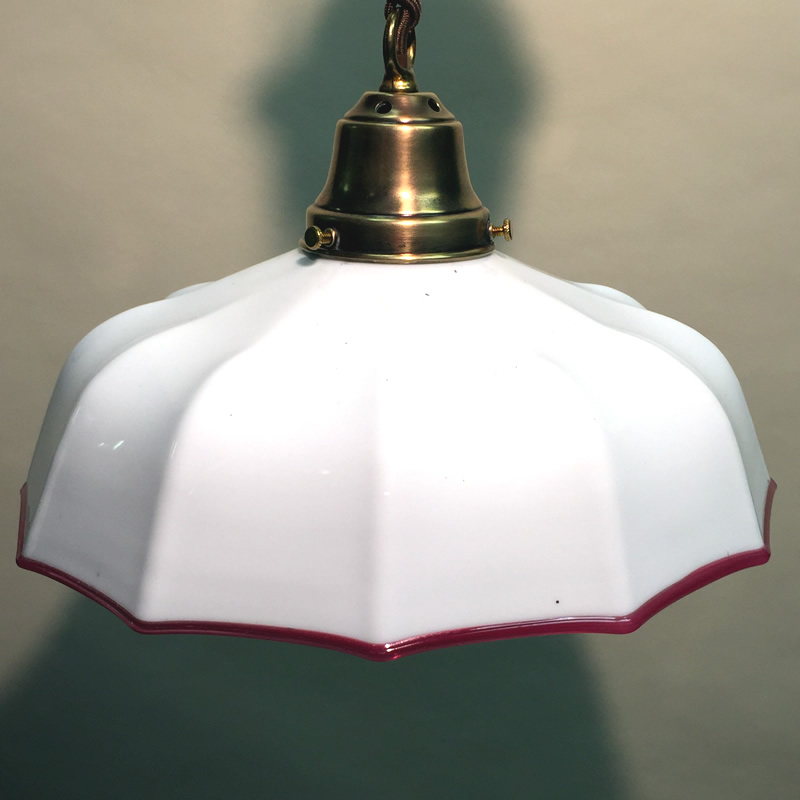 This rare counterbalance ceiling pendant, made of porcelain and brass, offers adjustable length and has a white porcelain shade with raspberry edge, c. 1910. Has old-style Edison bulb, but any Edison-size bulb will work. Probably made in France but unsigned; now converted to American wiring. Requires wall switch. Perfect for a window seat, over the kitchen sink, over your favorite reading chair, stairwell, hallway, etc. Current measurements: maximum length is 5′; minimum length is 30 1/2″ (can easily be shortened). Shade is 10 1/2″ in diameter. Newly wired.