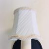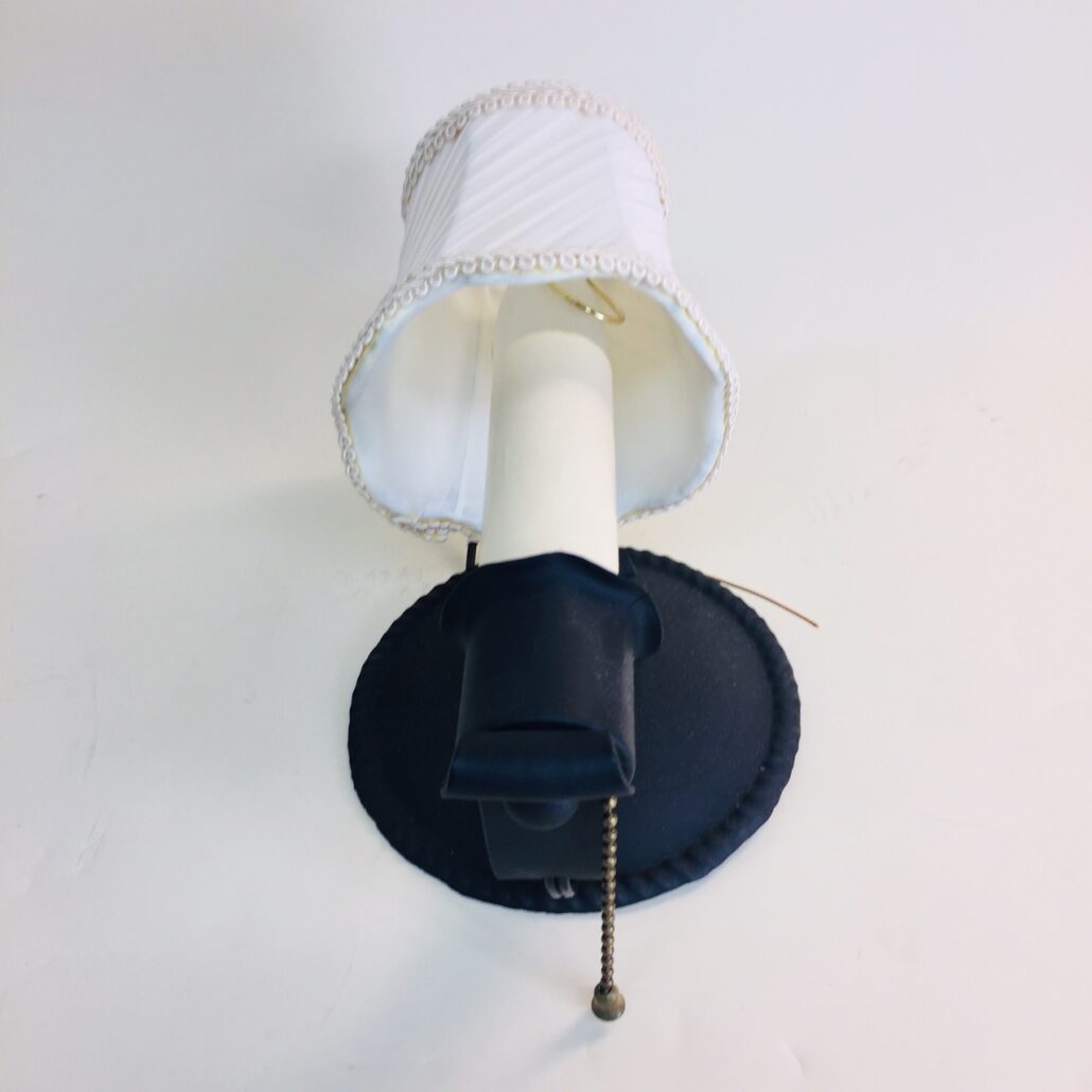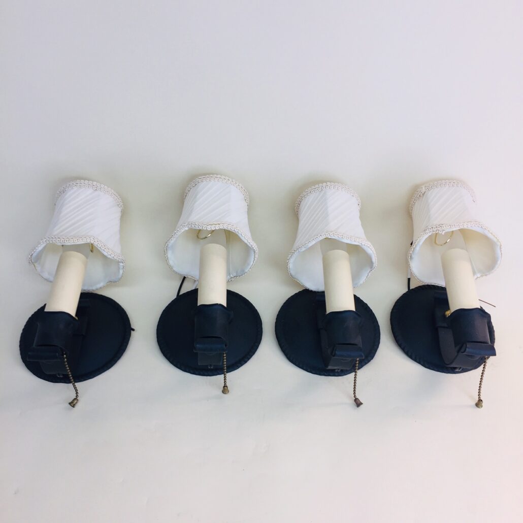 This is a beautifully restored set of four vintage sconces, c. 1930s. The base metal is steel, and we’ve painted them black to create an elegant look! Each one has a pull-chain switch, so each can be operated at the sconce, or they can be placed in the ON position and operated by a wall switch. In addition, these sconces have lined and pleated silk shades that are nicely trimmed along the top and bottom edges.