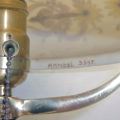 Signed “Handel” table lamp base with single pull-chain switch and painted tam-o-shanter glass shade, c. 1915. Shade has daisies design and is signed and numbered “Handel 3345”. Base is copper plated with nice patina; has one small blemish; just mentioning for accuracy. Spider that supports the shade is clean cast brass. Perfect for any room of the house. Measures 20 1/2″ high by 13” across the bottom of the shade. Rewired.