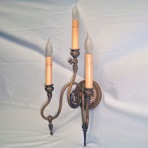 Awesome three-armed brass sconce, originally gas, now converted to electric. Has ribbed tubing on arms, draping bows on candle cups, and original gas cocks, c. 1880s. Requires wall switch. Perfect for entrance way, hallway, dining room, master bath, library, office, etc. Measures 21″ high by 9″ wide by 8″ deep. Newly wired with ground wire added.