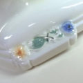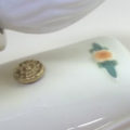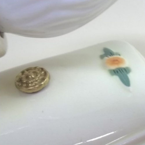 Rectangular shaped, antique white porcelain sconce with hand-painted apricot, blue and green florals, c. 1940s. External outlet has been disabled. Requires wall switch. This single porcelain wall sconce would be perfect for a bathroom, kitchen, pantry, or other small space. Measures 6 1/2″ high (7″ with bulb) by 4 1/2″ wide by 5″ deep. Rewired.