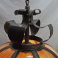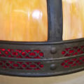 Arts & Crafts brass and slag glass dome chandelier, all original, c. 1910. Has two lights inside with pull-chain switches. Also has eight butterscotch and caramel slag glass panels in the dome and eight burgundy slag glass panels in the skirt. Can be operated by the pull-chains or placed in the ON position and operated by a wall switch. Perfect for dining room, entrance way, stairwell, over an island, etc. Measures 43 1/2″ long (fixture is 19 1/2″ high) by 18″ wide. Rewired with ground wire added.