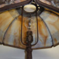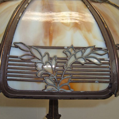 Vintage eight-panel caramel and butterscotch slag glass table lamp, originally gas and now converted to electric. Probably made by Empire but not signed, c. 1920s. Overlay has beautiful vining design. Has one pull-chain switch. Perfect for living room, dining room, bedroom, library, office, etc. Measures 21 3/4″ high by 17 1/2″ wide. Rewired.