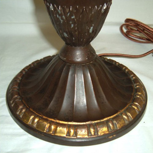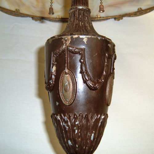Stately slag glass table lamp signed “Bradley & Hubbard“, c. 1920s, with three pull-chain switches. Base and shade show equal amounts of wear. Has eight opaque bent glass panels with two floral designs on each (some fading; mentioning for accuracy). Measures 24 1/2″ high by 20 1/2″ across bottom of shade. Rewired.
