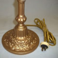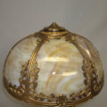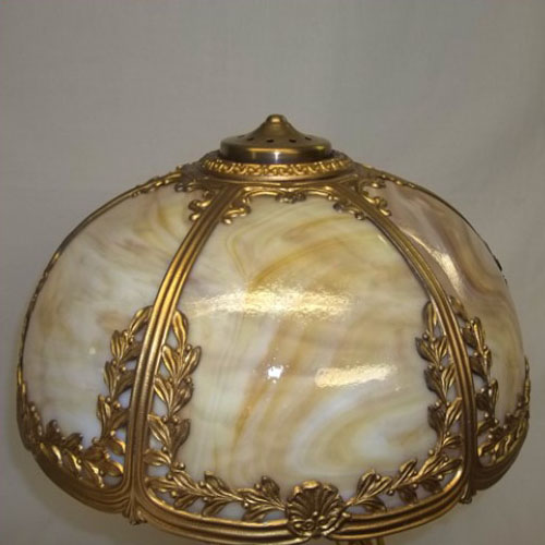 Fully restored slag glass table lamp with gold finish and single pull-chain switch, c. 1920s. Shade has six bent glass panels that are cream-colored with butterscotch running through. Perfect for library, living room, bedroom, dining room, entrance way, etc. Measures 20″ high by 16″ across bottom of shade. Base is 6 1/2″ in diameter. Rewired.