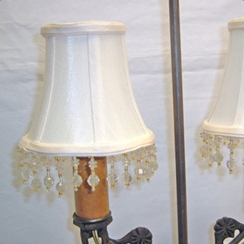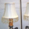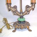 Cute two-armed, cast iron table lamp with original candle covers, c. 1930s. Base has green jadeite insert, turn switch, and traces of original brass plating. Beaded clip-on cloth shades are replacements. Eagle finial tops off the lamp. Perfect for nightstand, buffet table, entrance way, desk, etc. Measures 20 1/2″ high by 12″ wide by 5 1/2″ deep. Rewired.