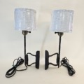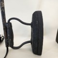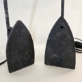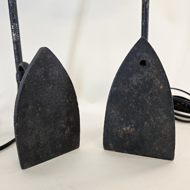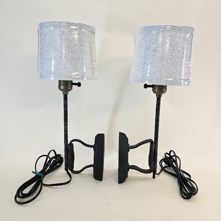 Though these two cast iron irons are not an identical pair, they are two vintage irons converted to lamps. They’re from the early 1900s. They were converted by someone else some time ago and then rewired by us here at Old Lamps & Things. We added new clip-on shades to complete them. If you don’t care for our choice or shades, you can always shop for something that you might like better.