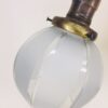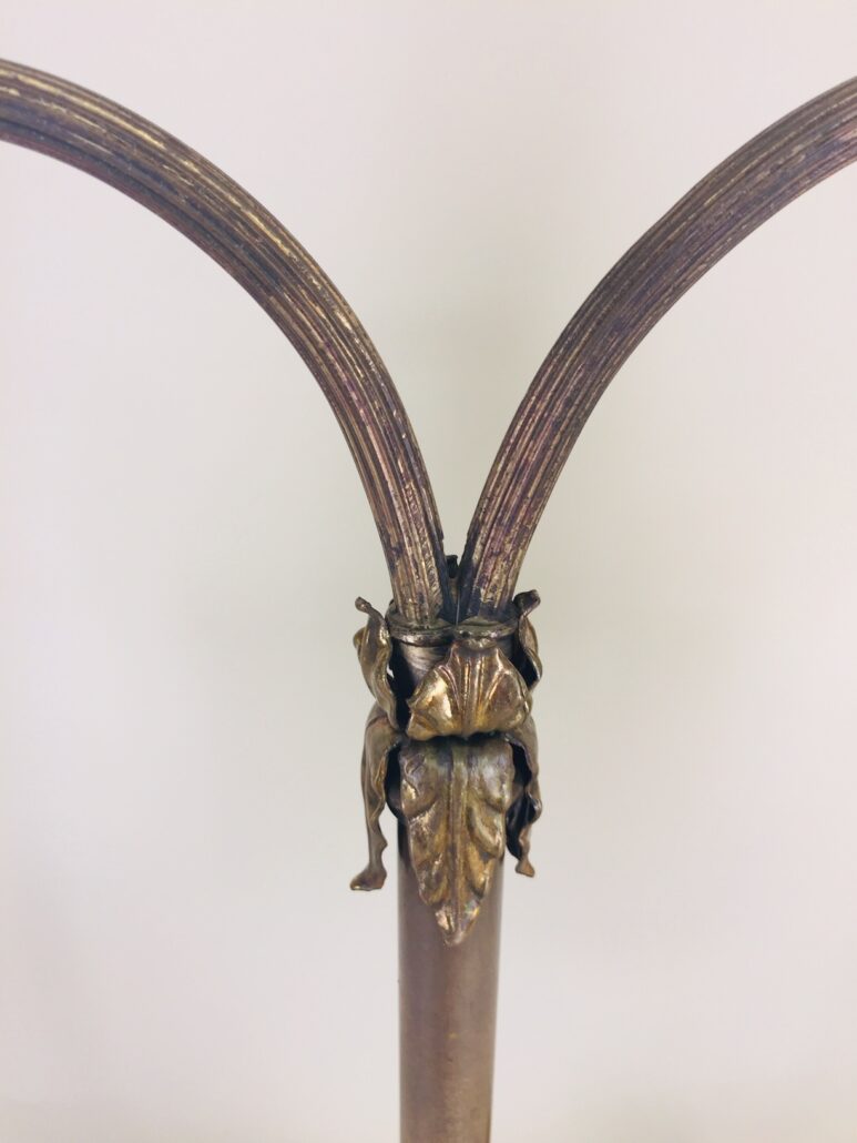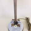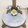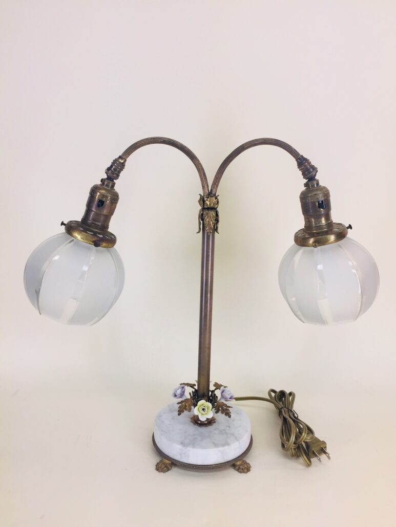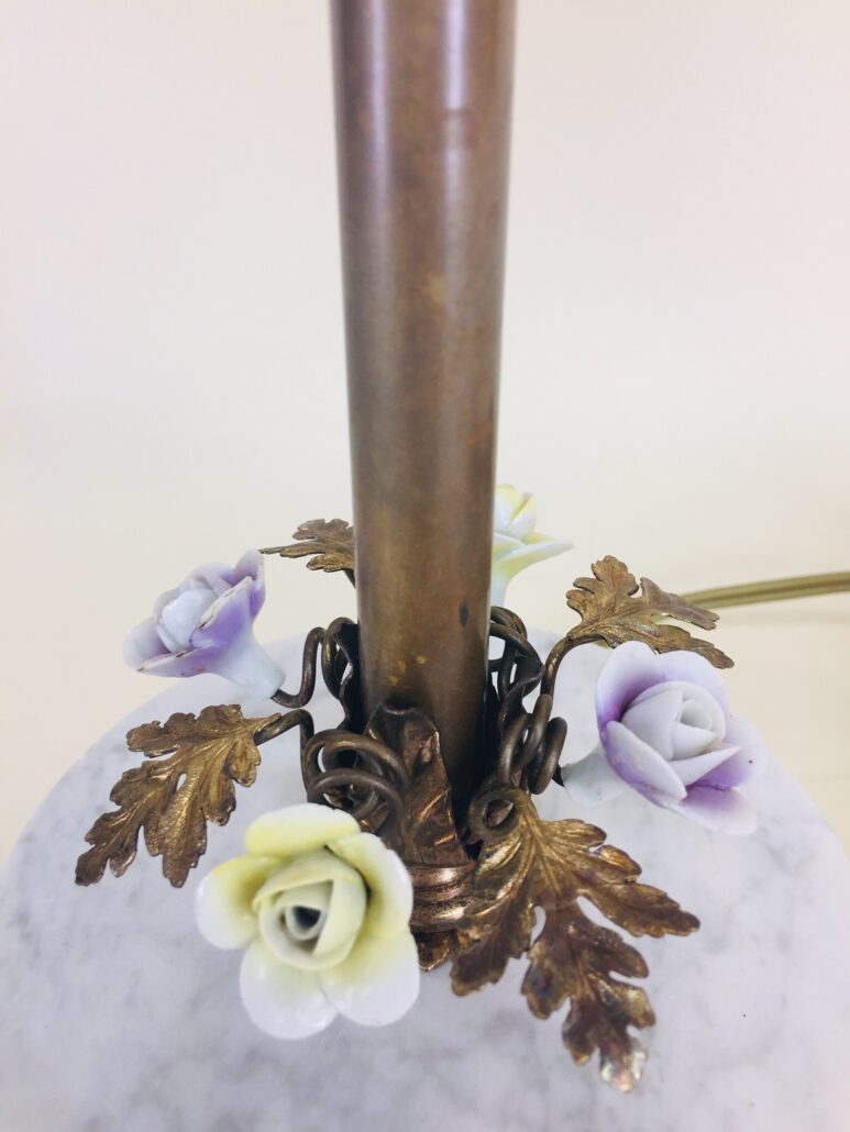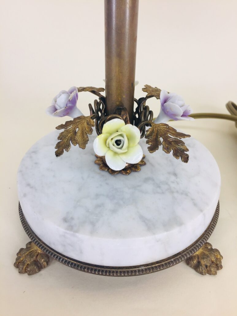 This beautiful Victorian style table lamp with porcelain flowers and brass leaves is in excellent condition, c. 1930s. It has four flawless porcelain flowers — two yellow and two lavender, with a brass leaf between each flower. Below the flowers is a white marble disk with gray striations running through it, and it sits on a round brass brass that has four lion’s feet. The vintage glass shades are petite and have wide satin and clear stripes. Each light has its own push-through on/off switch, so you could use just one side for less light, or both for more light. It also has swivels that allow the sockets to be moved up or down in order to direct the light where it’s needed most. Perfect for living room, family room, entryway, stairway landing, bedroom, library, etc. Measures 15 1/2″ high by 17″ wide (across shade bottoms) by 6″ across the feet. Rewired.
