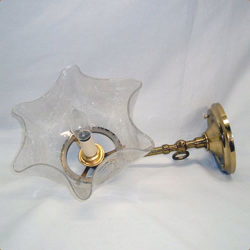 Single vintage brass wall sconce signed “Welsbach System, pat. Mar. 15, 1887″ on air valve, originally gas but now converted to electric. Has vintage stencil-etched gas shade with hand-blown ruffled edge. Requires wall switch. Perfect for bedroom, family room, dining room, entrance way, hallway, bathroom, etc. Measures 8 1/2″ high by 9″ wide by 13” deep. Carefully converted to electric with ground wire added.