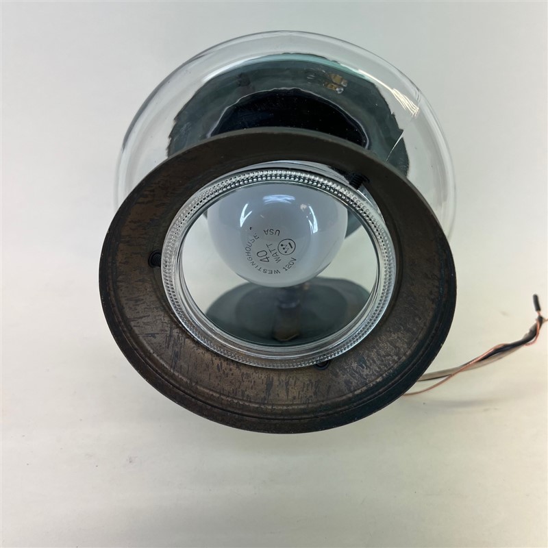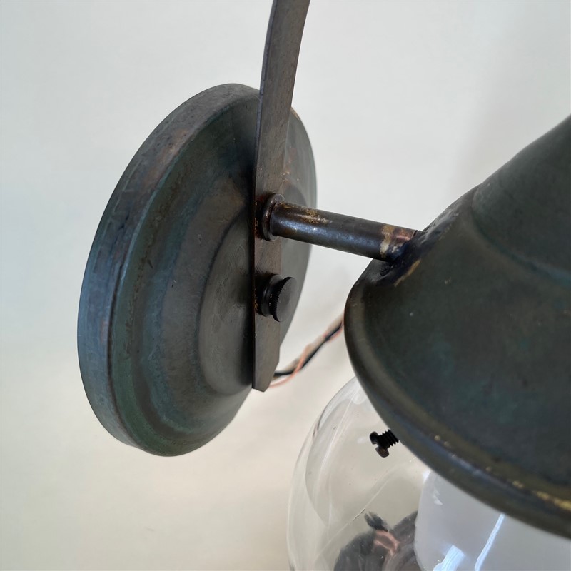 This vintage copper outdoor sconce hails from the Art Deco period, c. 1930s. It has its original clear glass globe and rich patina. The wall plate is round and definitely shows its age! It can be used indoors or out. If you choose outdoors, it does not need to be protected from the elements. It’s designed to handle snow and rain. A wall switch is needed to operate this fixture. The bottom of the sconce is open for easy bulb changing!