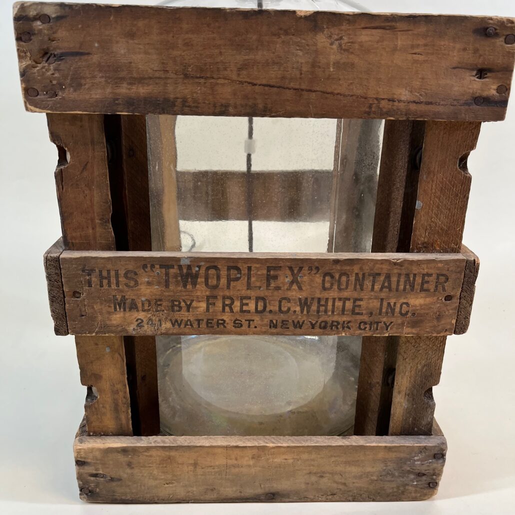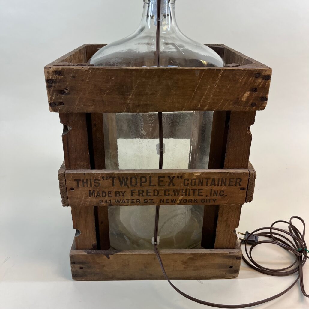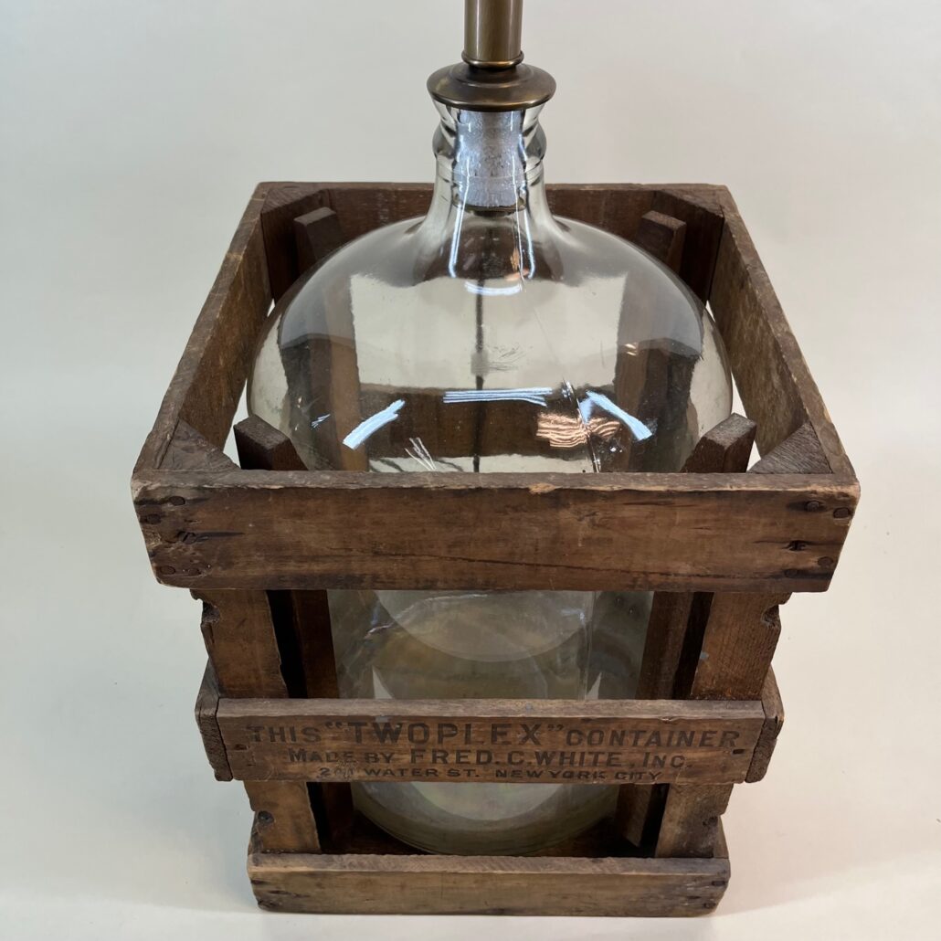 The wooden crate was used in the olden days to safely transport glass water jugs. It has a spring-loaded wooden stick in each corner to hold the bottle in place. This crate is in excellent original condition and has lots of natural patina. It’s clearly marked as follows: “This ‘TWOPLEX’ container Made by Fred. C. White, Inc., 241 Water St., NYC. Saratoga State Seal”. We decided to repurpose it so it could live another generation or two! We used vintage brass parts to create a standing lamp with two pull-chain switches. In addition, we used a vintage, four-sided, pyramid-shaped shade and an old finial to finish off our creation!