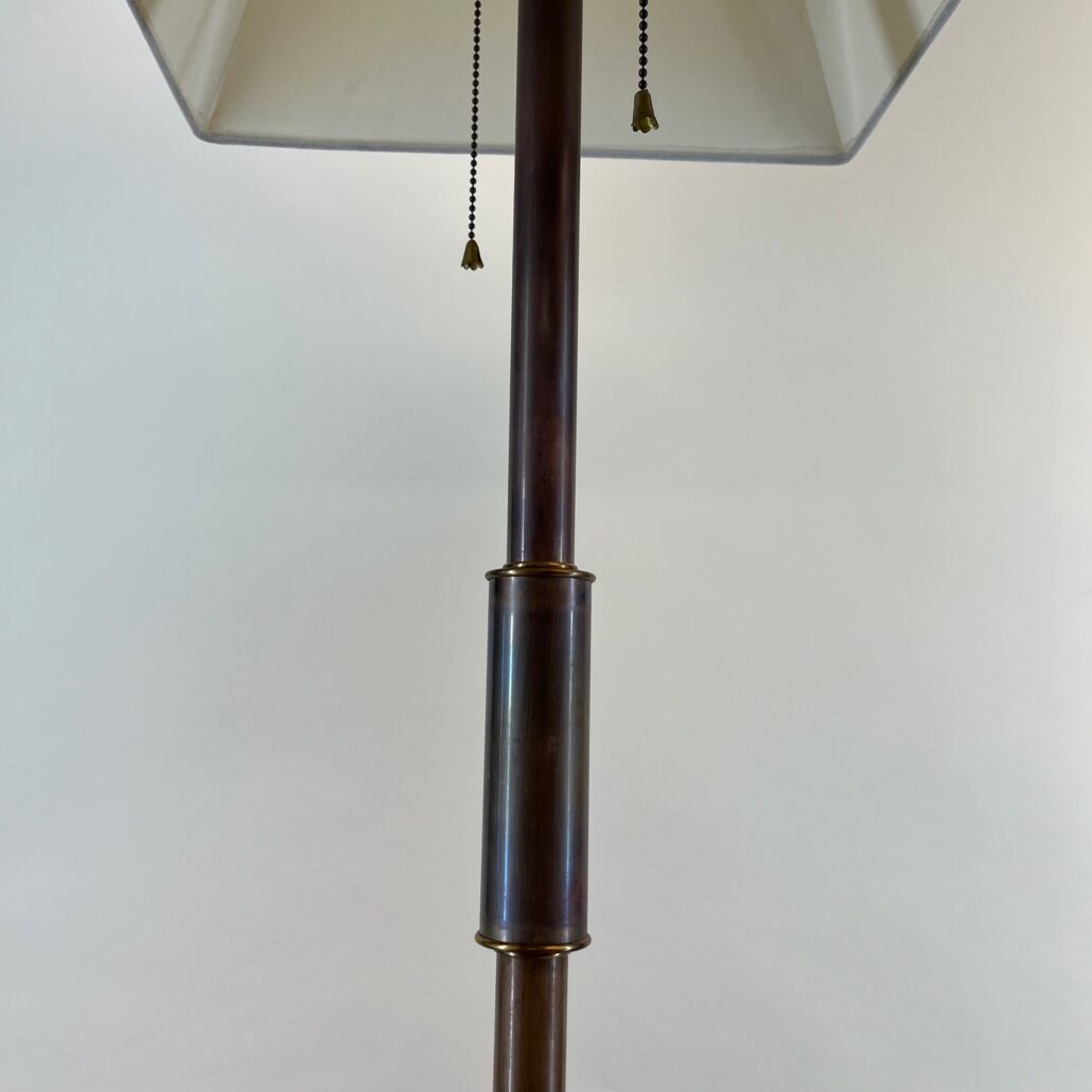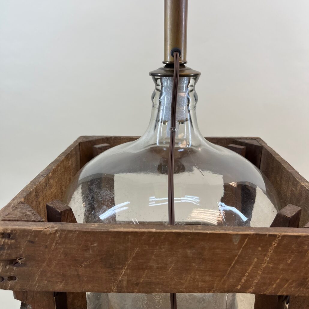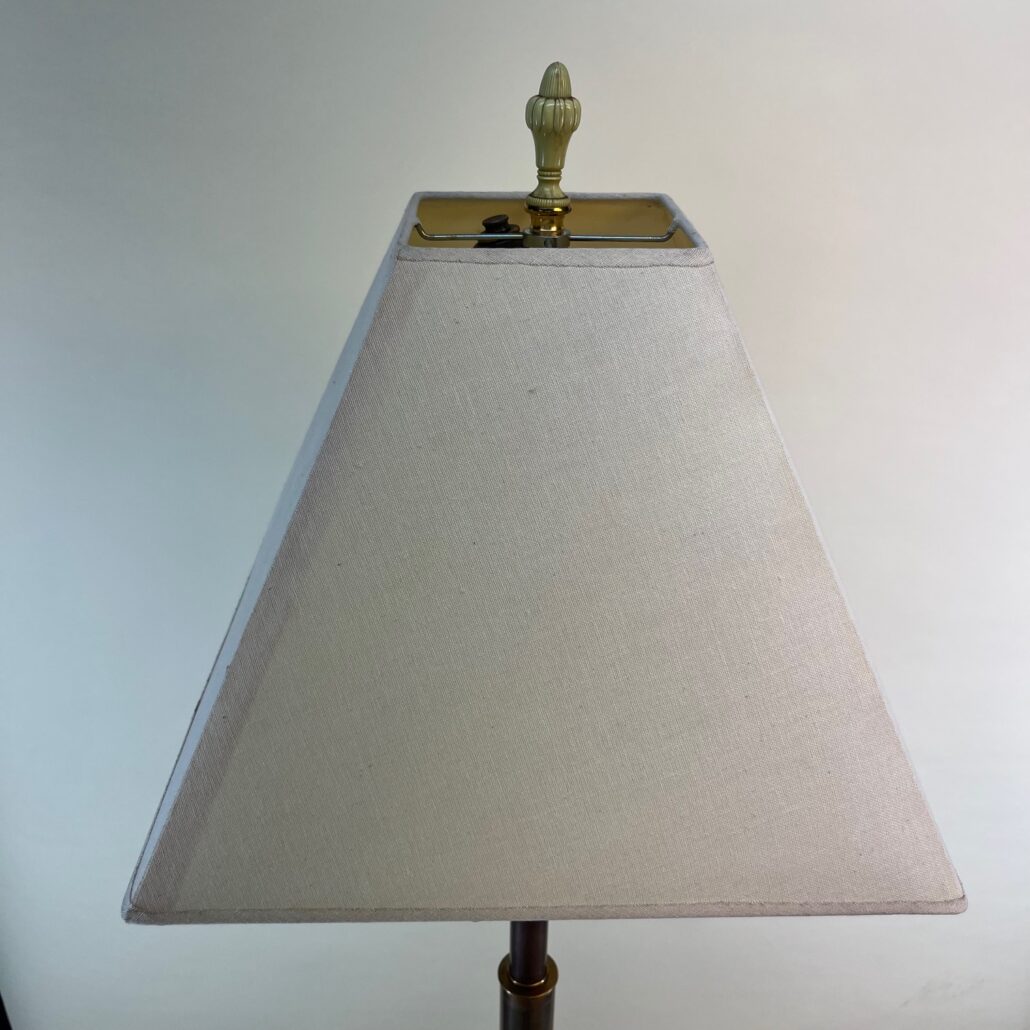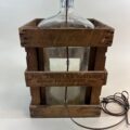 The wooden crate was used in the olden days to safely transport glass water jugs. It has a spring-loaded wooden stick in each corner to hold the bottle in place. This crate is in excellent original condition and has lots of natural patina. It’s clearly marked as follows: “This ‘TWOPLEX’ container Made by Fred. C. White, Inc., 241 Water St., NYC. Saratoga State Seal”. We decided to repurpose it so it could live another generation or two! We used vintage brass parts to create a standing lamp with two pull-chain switches. In addition, we used a vintage, four-sided, pyramid-shaped shade and an old finial to finish off our creation!