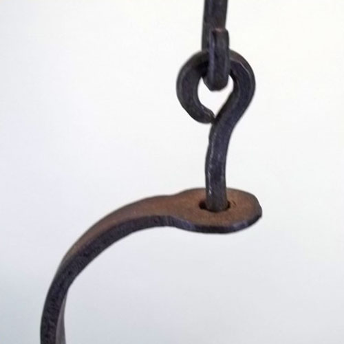 Hand-forged wrought iron whale oil Betty lamp, c. mid-to-late 1700s, with hanging hooks, all in excellent original condition. Pre-dates whale oil lamps that had wick holders. Perfect for Betty lamp collectors or people who just like primitives. Measures 13 3/4″ long by 4″ wide.